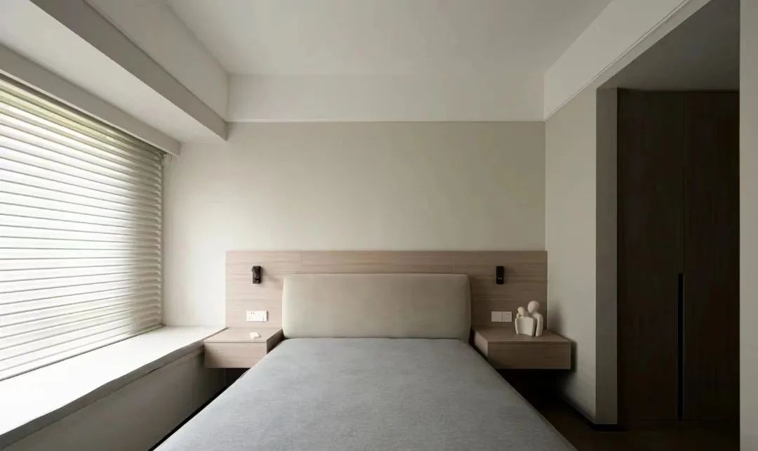 客卧的设计非常简单,没有过多的装饰,整体色调低饱和度,透着淡淡的暖感,让人心生安全感,想一直待在这里。
